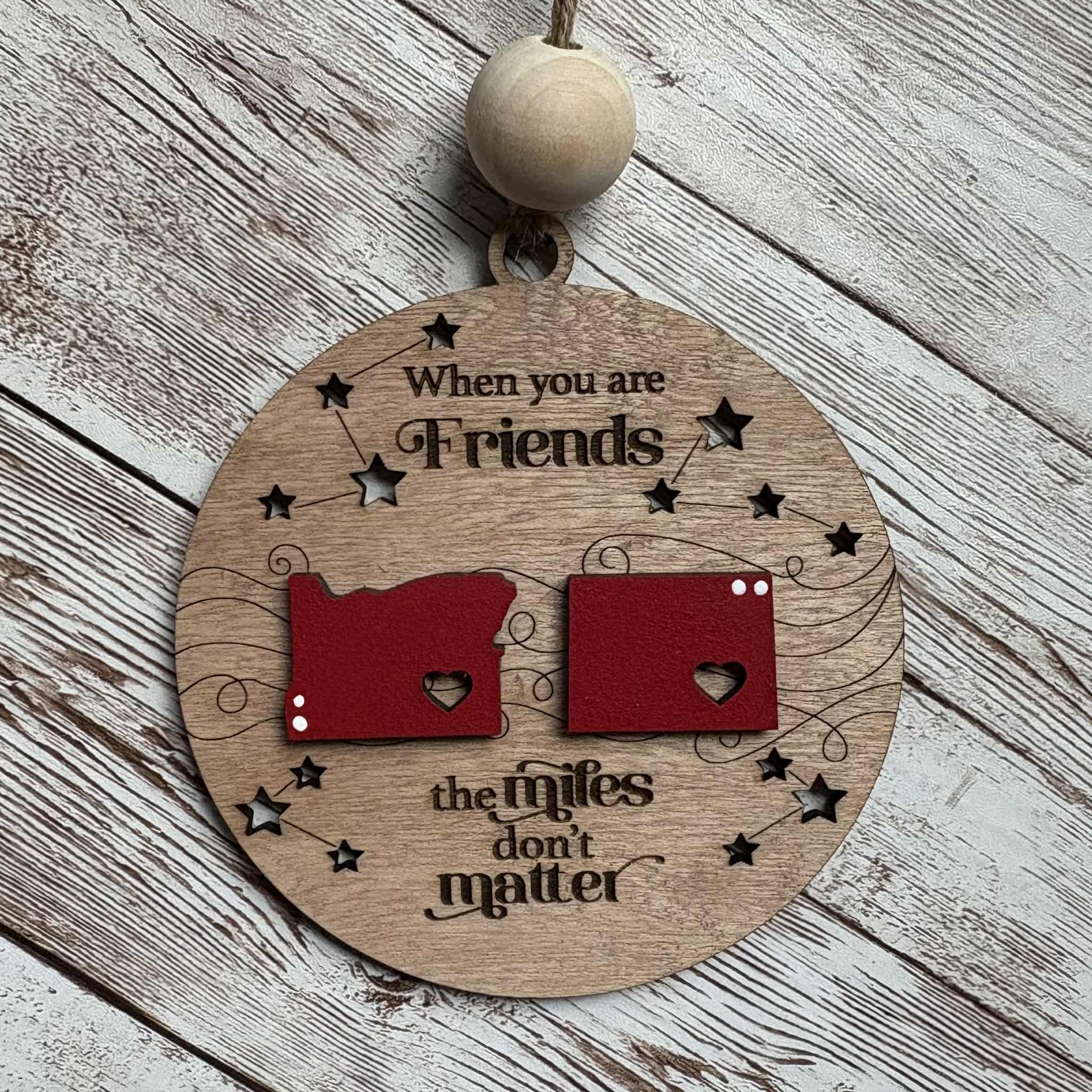 Celebrate the special bond that distance can’t break with this personalized ornament featuring your chosen states. Each piece beautifully connects two hearts across the miles, reminding us that family or friends are always close — no matter how far apart.